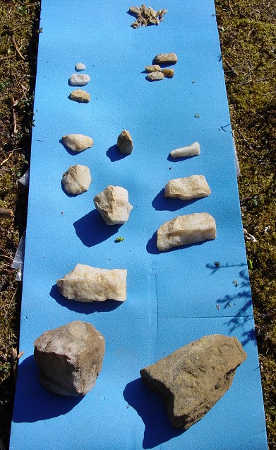 Akonpohjan kvartsilöytöjä. Alhaalta ylös: alasinkivi, isketty raaka-aine kimpale, ytimiä, esineitä ja iskoksia.
