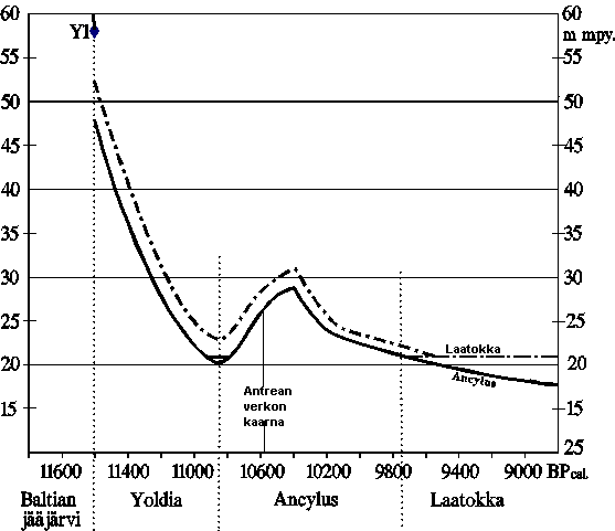 Rannasiirtymiskäyrä Vuoksenrannan Korpilahden alueella ja Antrean Sokkalan Niukkalin kohdalla (katkoviiva). Tulkittu Saarnisto & Grönlund 1996 mukaan.