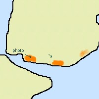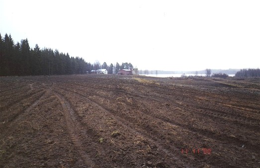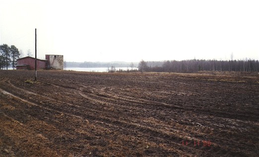 | Pellosta muinaisen uoman rantatörmän laelta on kerätty löytöjä (kvartseja) kahdesta eri kohden. Pelto kohteiden 15 ja 16 välillä oli löydötön. Yläkuvassa kohde 15 etualalla (ja osin oik. selän takana) ja kohde 16 lähellä järveä rehusiilon tasalla. |
