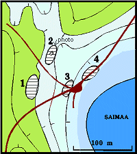 Tällä paikalla on todettu neljä eri aikaista esihistoriallista asuinpaikkakohtaa. 1 Kivikautinen asuinpaikka n. 4000-3500 ekr. kampakeraaminen aika. 2 Kivikautinen asuinpaikka n. 3700-3000 ekr. myöhäiskampakeraaminen aika. 3 Kivikautinen asuinpaikka n. 3000-2000 ekr. kivikauden loppu. 4 Varhaismetallikautinen asuinpaikka n. 2000 ekr --> Asutus on seurannut laskevan vedenpinnan kintereillä. Asuinpaikkojen rajaukset ovat karkeita arvioita. Paikalla on opastaulu. Kuvissa laipio on asumuspainanteessa, joka on jäänne osittain maahan kaivetusta talosta. |