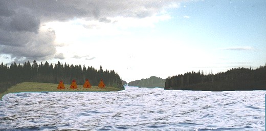 Vieressä ylemmästä kuvasta tehty rekonstruktio asumisen aikaisesta maisemasta (virhe: kuusen ei pitäisi vielä maisemassa näkyä, sen tilalla koivua ja mäntyä, rannassa leppää).