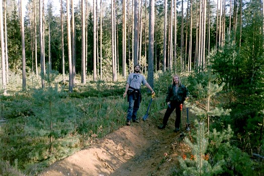eikä niitä sitten ole saatu sukellettua talteen. Kesällä v. 2000 suoritetussa muutaman päivän inventoinnissa lähistöltä (5-8 km etäisyydeltä) löytyi 25-30 m korkeustasoilta kivikautisia asuinpaikkoja, jotka lienevät verkon aikaisia. Tutkimukset alueella jatkuvat kesällä 2001 (mikäli sponsori Mikroliitti Oy antaa rahaa). Kesän 2000 tutkimusta avusti myös Riihimäen kaupunki. Alakuvassa v. 2000 expedition jäsenet Aivar Kriiska ja Tapani Rostedt juuri löydetyllä uudella varhaiskivikautisella asuinpaikalla Antreassa. Kuvaaja ryhmän kolmas jäsen Timo Jussila. |