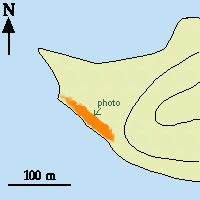 Varhaismetallikautinen asuinpaikka. Asumuspainanne punaisen viivan kohdalla. Paikka ei eroa mitenkään kivikautisista asuinpaikoista, paitsi että se sijaitsee alemmalla korkeustasolla, johtuen Saimaan veden laskusta. Esineistössä on tyylieroja, mm. keramiikassa. Kvartsi on edelleenkin käytetyin tarvekalumateriaali (meille säilynyt materiaali). Viereisessä kuvassa asbestisekotteista tekstiilikeramiikkaa asumuspainanteeseen tehdystä koekuopasta. |
