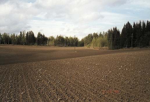 7-8, Västinniemi Valkeinen, asuinpaikka 8 etualalla ja 7 takana olevan pellon reunassa rinteen päällä. Kuvattu pohjoiseen.