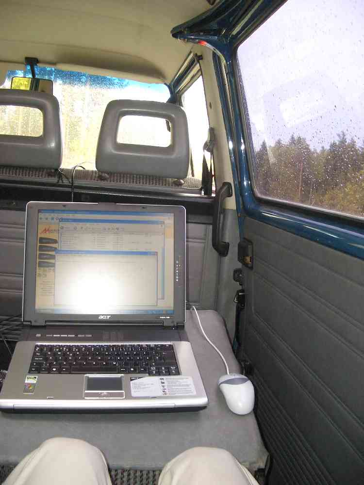 Koska päivä oli sateinen, toimisto siirrettiin kokonaan auton suojiin.