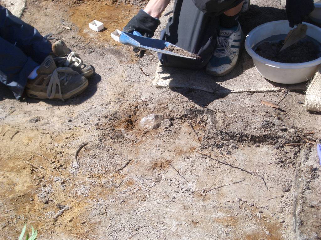 Isoa kvartsikimpaletta kaivetaan esiin. Kyseessä on ehkä kvartsiydin.