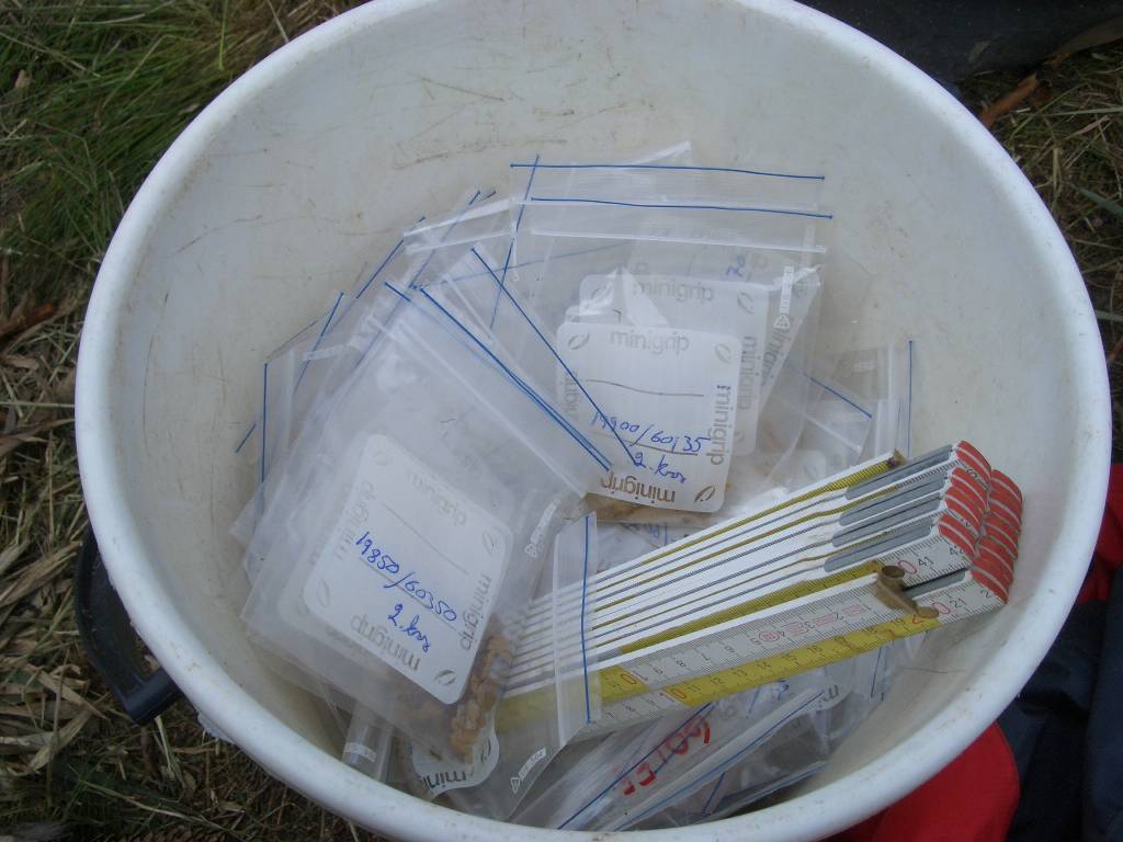 Löydöt pussitetaan ja niihin merkitään löytökoordinaatit ja -kerros myöhempää luettelointia varten.