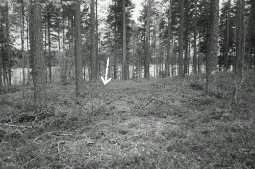 Asuinpaikka aluetta. Koekuoppa ja painanne nuolen kohdalla. Kuvattu lounaaseen. Taustalla Kuolemanlahti.