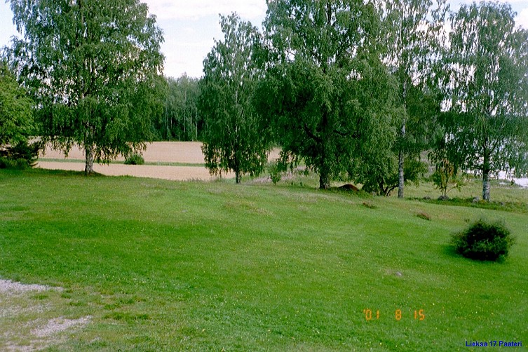 Kuvattu länteen. Asuinpaikkalöytöjä puiden tasalta. Vanha navetta heti kuvan vasemmalla puolen.