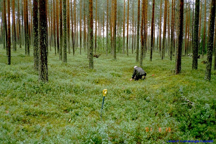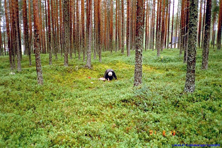 Kuvattu länsi-luoteeseen. Antti Krapu tutkii asumuspainannetta.