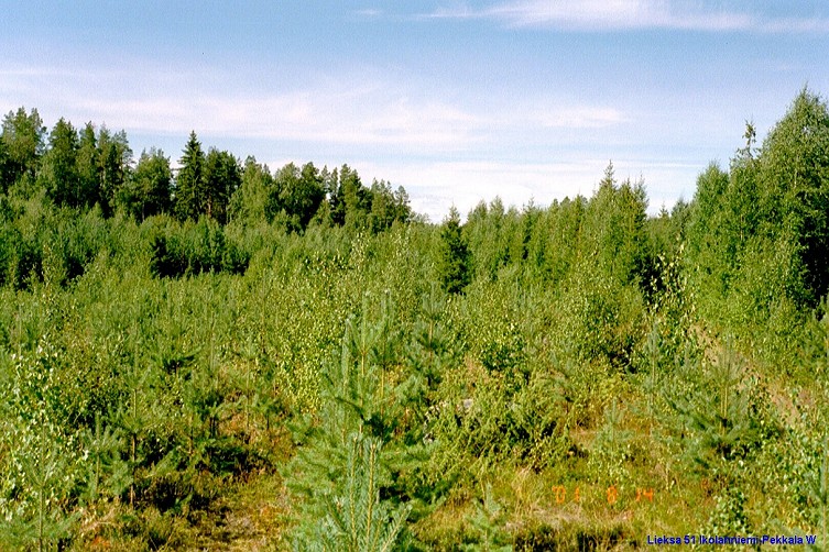 Kuvattu länteen. Kuvan vasemmassa laidassa häämöttää vesakon seasta rantaan menevä tieura. Löydöt siltä kohden, missä tieura sukeltaa vanhempaan metsään ja siitä vasemmalle kuva alan ulkopuolelle.