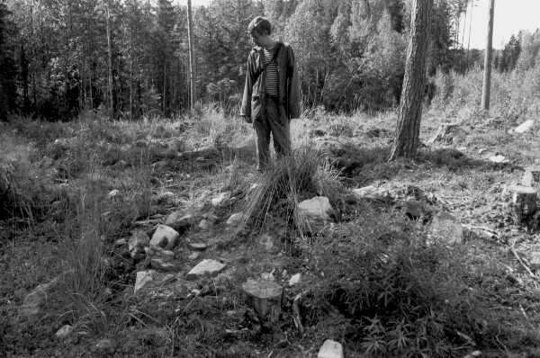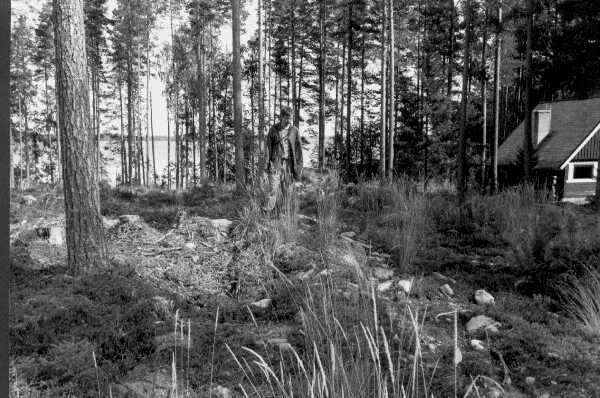Tutkija Juha Hirvilammi seisoo runnellun raunion päällä. Kuvattu länteen.