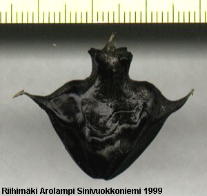 15.6.99. Suopellon liejukerroksesta löytynyt vesipähkinä. Kuva on otettu tasoskannerilla.