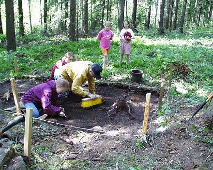 8.6.99 Asuinpaikalla 2 (70 m pääkaivausalasta luoteeseen) kaivetaan pienen koealan pintaa (A0-kerros).