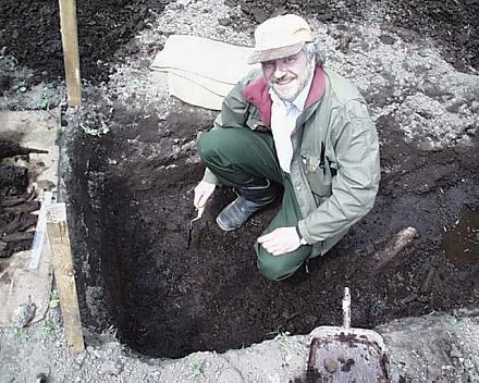Suopellon kaivaus. Kaivaja on hetki sitten löytänyt saviastianpalan liejusta. Kaivausteknikko T. Jussila tarkastelee löytöpaikkaa.
