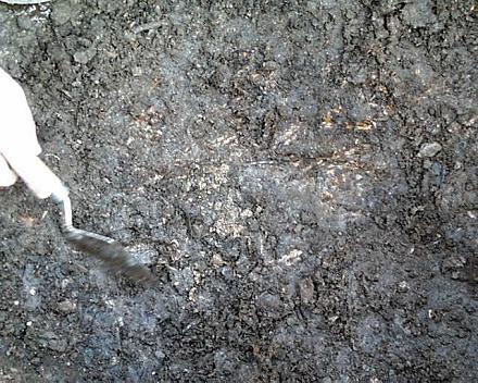 Keramiikan murusia saviliejussa n. 50 cm syvyydessä. Suurin pala on jo nostettu pois (ks. saviastian palan kuva).