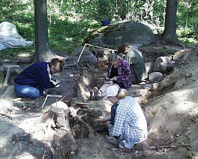 17.6.99. Vas: Viimeistä profiilia viimeistellään, kivikon keskus on kaadettu. Oik: 2. asuinpaikalla kannon kupeessa kivien päälle asetettu laakakivi. Sen alla komea kvartsiydin ja tietenkin luuta. Muuten alue pohjaan kaivettu.