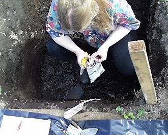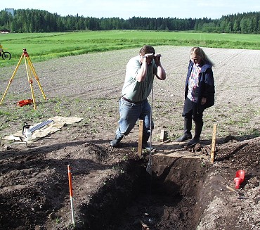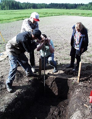 Suopellon kaivausalue. kairanäytteenotto suosta. Oikealla ns. 'pikkuryssä' eli pieni venäläismallinen kaira (lainassa Helsingin Yliopiston geologian laitokselta). Erinomainen laite suonäytteiden ottoon. Näytepesän korkeus on 50 cm. Alla: Heikki Matiskainen ottaa näytettä kaivausalueen pohjasta alaspäin. Kaira painetaan alas, kierretään ja näyte jää kairapesän sisälle. Toinen näyte otetaan täsmälleen ensimmäisen alapuolelta, niin että saadaan katkeamaton sarja. Alimpana: Kersti Kihnu ottaa kaivausalueen seinämästä sentin välein näytteet käsipelillä. Seinämään on pienillä lankanauloilla merkitty cm mitta. |
