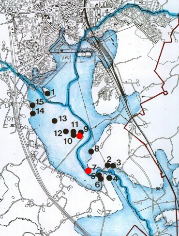 Silmäkejärvi noin 4000 eKr. Pallot ovat esihistoriallisia asuinpaikkoja (ks. lista sivun lopussa). Punaiset pallot ovat kaivauskohteita. ![]() |