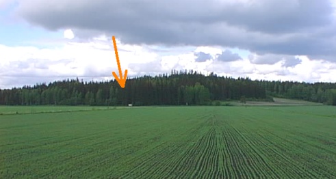 Sinivuokkoniemi joen ja pellon takana kuusikossa: