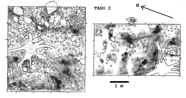 Sinivuokkoniemi Karttaluonnos, taso 2, n. 10 cm syvyydellä mineraalimaan pinnasta. 'Huononnettu' ja pienennetty harmaasävykopio