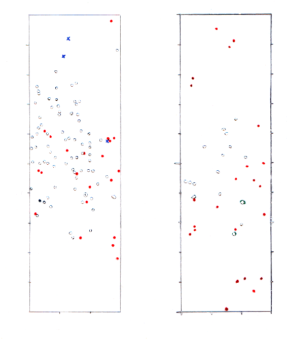 Löytökarttaluonnos alueelta 1 kerrokset 1 ja 2. Punainen piste on kvartsi tai kivilaji-iskos. Musta piste on saviastian pala. Sininen ruksi on palanut luu. Musta ympyrä on idolin katkelma.