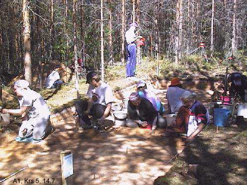 Alueen 1 viidettä kerrosta kaivetaan. Kuvattu pohjoiseen. Taustalla tehdään verkkoprojektiomittausta prisman mittanauhan ja vaaituskojeen kanssa (eli aluetta vaaitaan 1 m verkossa).