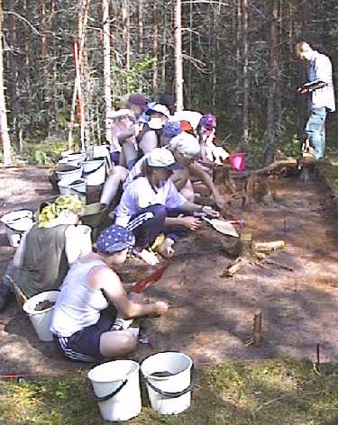 Aluetta 3 on aloitettu kaivamaan tasarintamatekniikalla. Siinä kaivajat asettuvat tiiviiseen riviin kaivettavan alueen yhdelle laidalle. Kaivajat kaivavat omaa kaistaansa perääntyen. Maa irroitetaan lastalla ja vedetään rikkalapioon (jossa maata voi vielä penkoa löytöjen varalta) josta maa kaadetaan ämpäriin. Kaivettu maa kannetaan ämpärillä hiekkakasaan kaivausalueen laidalle. Kaivettaessa esiin tulevat juuret katkotaan oksasaksilla. Löydön kaivaja jättää paikoilleen tai asettaa sen pieneen muovikoteloon joka jää löytökohdalle. Löydölle mitataan koordinaatit cm:n tarkkuudella, jonka jälkeen löytö laitetaan pussiin.