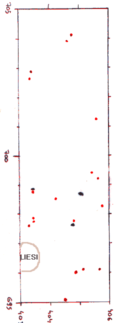 Alue1, kerros1, alustava löytökartta (varsinaiset kartat tulostamme aikanaan tietokannasta). Punaiset "tahrat" ovat kvartseja, siniset saviastian paloja. Muuta ei ole vielä tullut esiin.