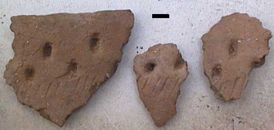 Saviastian paloja alueelta 1. Vasemmalla reunapala. Reunan alla kuoppakoristevyöhyke ja sen alla kampaleimarivi. Keramiikka on myöhäistä kampakeramiikkaa (tai tyypillisen kampakeramiikan loppuvaiheesta).