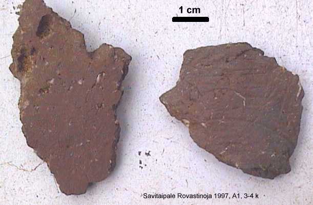 Saviastian paloja alueelta 1. Vasemmalla kivimurskasekotteinen n. 6 mm paksu pala, jossa