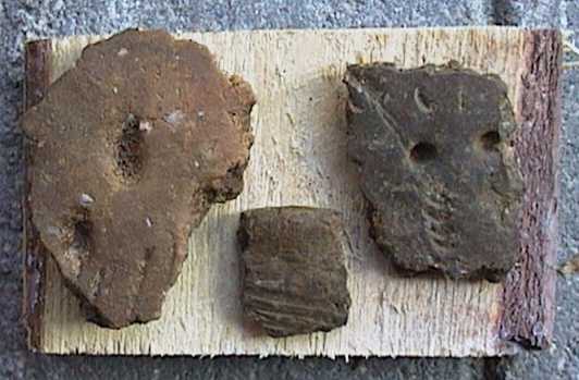 Saviastian paloja kaivausalueelta 1. Reunimmaiset palaset edustavat sisämaan myöhäis kampakeramiikkaa ja keskimmäinen pieni reunapala mahdollisesti ns. Kierikin tyypin asbestikeramiikkaa.