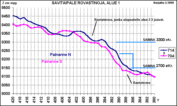 Profiilikuva maastosta Alueelta 1, x-linjalta 704 ja 714, eli alueella olevien asumuspainanteiden kohdalta (ks. verkkoprojektio alueelta 1). Pystymittakaava on korostettu. Vaakaväli on 1 m, pysty 50 cm.