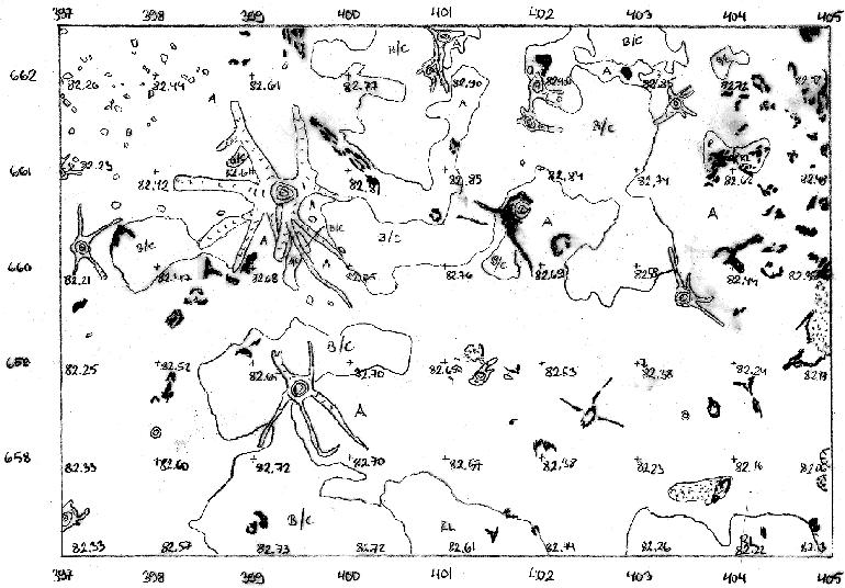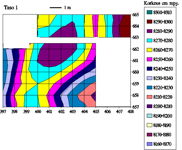 Tasoa 1 ei puhtaaksipiirretä. Alla on skannattu kenttäkartta alueesta 3 tasosta 1 (piirt. P.Pesonen, kuvan pienentäminen on heikentänyt kartan laatua). Pintamaa heti turpeen alla on voimakkaasti luonnollisen maannostumisen ja muiden luontaisten asutuksen jälkeisten tapahtumien runtelema (metsäpalot, kasvit ym.). Siitä