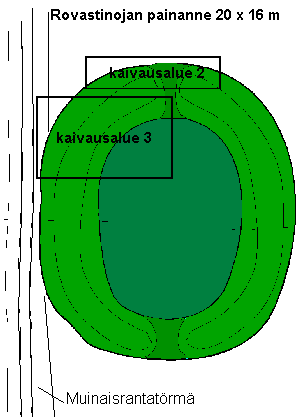 Painanteeseen on avattu kaksi kaivausalaa, joista toinen (alue 3) leikkaa vallin ja oviaukon.