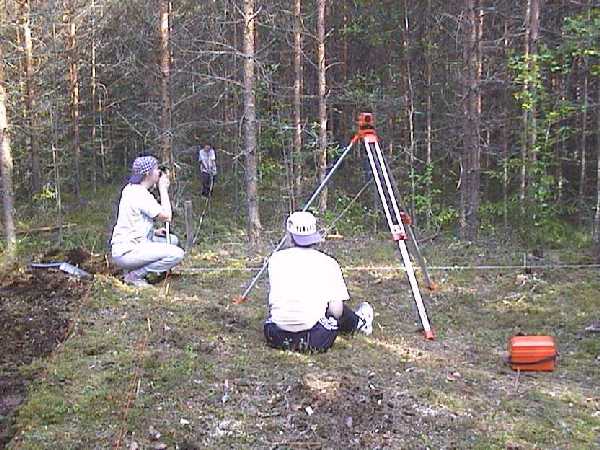 Asumuspainanteen ympäristö kartoitetaan vaaitsemalla maanpinnan korkeus metrin verkossa. Kyykyssä oleva kaivajatyttö asettaa prisman avulla vaaittavan linjan kohtisuoraan peruslinjaan nähden alueiden 2 ja 3 rajalla muinaisen rantatörmän päällä.