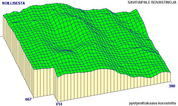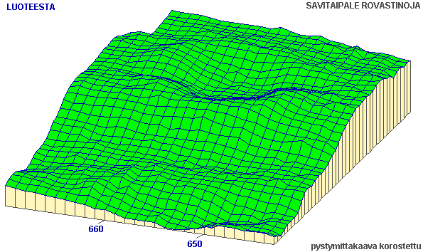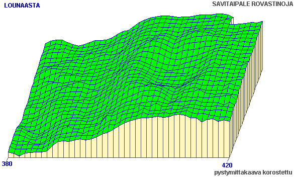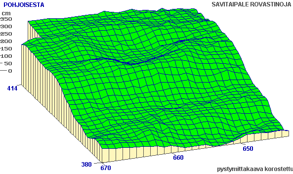 Asumuspainanteen ympäristön verkkoprojektiokarttoja neljästä eri suunnasta. Kartassa erottuu painanteen luoteispuolella kaksi rantatörmää, joista alempi näkyy vain osittain. Painanne on muinaisrannan suuntainen. Oviaukot erottuvat vallissa olevina koloina painanteen päissä. Vertaa alueen 1 verkkoprojektioon ja painanteen projektioon (osasuurennos näistä kuvista). (yleiskarttaan)