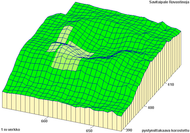 Alueen 2-3 suuren asumuspainanteen verkkoprojektiokartat kahdesta suunnasta. Kaivausalueet vaalean vihreitä.