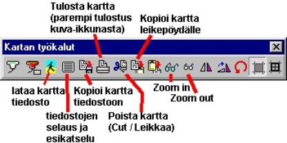 Kartta-ikkunan kokoa voi muuttaa vain valikon + - napeilla. Kartan (ja kartta ikkunan) voi pyytää esiin 1/1 koossa eli kuvan kokoisena tai 1/2 kuvan kokoisena.