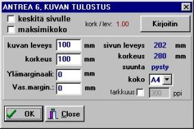 Tulostusdialogissa voi antaa tulosteen leveyden tai korkeuden millimetreinä. Ohjelmaa muuttaa leveyden tai korkeuden aina niin että kuvasuhde (leveys/korkeus) säilyy. Tulosteen ylä- ja alamarginaalit voidaan määrätä. Kuva voidaan käskeä tulostumaan maksimikoossa eli niin suurena kuin sivulle mahtuu (kuvan korkeus/leveys suhde huomioonottaen). Sivun asento: vaaka tai pysty - voidaan valita normaalisti kirjoittimen asetuksista (nappi kirjoitin). Jos kartta on asemoitu, voidaan valita myös mittakaava, sivukoon puitteissa (toistaiseksi vain Kartta-Soar:issa) . Mittakaava annettaessa muuttuu tulostettavan kuvan mitat leveys- ja korkeus kentissä ja vastaavasti mittakaava kun tulostusmittoja muutetaan. Ohjelma ei ehkä aina osaa tulkita oikein kirjoittimelle määrättyä sivun kokoa. Sen voi antaa "väkisin" koko-kentässä (ei vaikuta kirjoittimeen, vain kuvan koon ja mittakaavan laskentaan). Vastaavasti ohjelma saattaa joskus tulkita väärin myös kirjoittimen tulostustarkkuuden (yleensä 300 tai 600 dpi), joka vaikuttaa kuvan tulostusmittoihin. Tulostustarkkuuden voi tarvittaessa kertoa ohjelmalle tarkkuus-kentässä, kun ensin on kruksattu sen vieressä oleva ruutu tarkkuus.