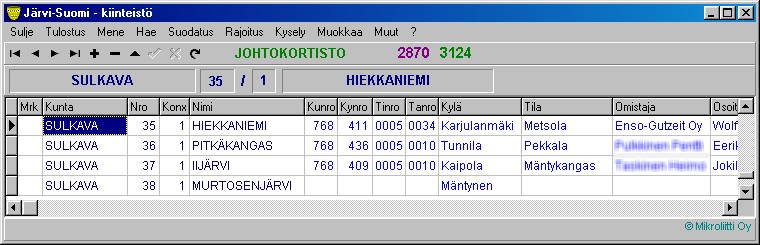 kiinteistö-kortin automaattisesti täyttyvä otsikko (kunta, nro, konteksti, nimi) tulee näkyviin jos paikkaa/kontekstia koskevaan korttiin on syötetty tietoa. Kortissa on lisäksi 15 tietopaikkaa (kenttää), joita voi täyttää ja tarkastella vain taulukkona, jossa rivi edustaa yhtä kiinteistöä. Uusi tyhjä rivi saadaan esiin yläpalkin + -merkistä . Rivi voidaan poistaa yläpalkin - -merkistä.