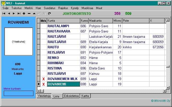 • Indeksoitu kenttä kunta liittää kunnat-kortiston Nili-tietokannan muihin kortistoihin.