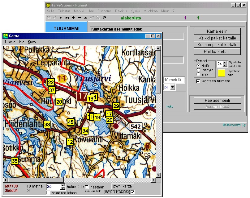 Alla kuvassa on kunnan kartta otettu esiin ja siihen on tulostettu kunnan paikat neliönä, jonka sisälä on paikan numero. Klikkaamalla symboliin, tulee rekisterikorttiin ko. paikka. Kursoria kuljetettaessa kartan päällä, rullaavat karttakoordinaatit karttakuvan alapuolella.