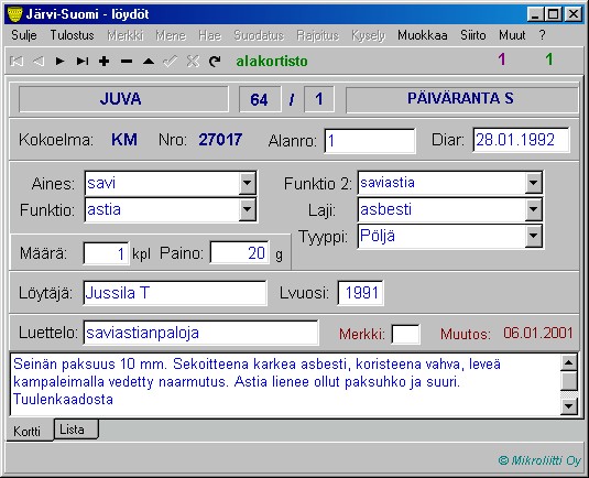 MÄÄRÄTIETO. - löytö-kortisto tarkastelee aineistoa eri lajeja edustavien löytöjen massana eikä tarkastele erillisiä löytökappaleita. Siksi kortissa on kentät lajia edustavien kappaleiden lukumäärälle ja painolle.