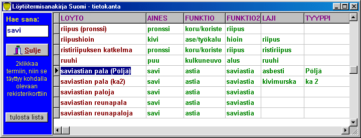 • Luettelointiohjelma käyttää löytöluettelossa ensisijaisesti tätä termiä. Jos tämä on tyhjä käytetään Aines->Tyyppi -termejä. Sen, kumpaa termistöä käytetään, voi myös valita luettelointiohjelmassa.