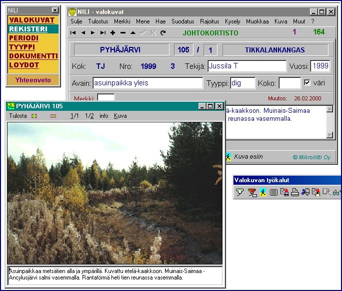 OTSIKKO. - valokuva-kortin otsikko ei ole näkyvillä. Se on kuitenkin olemassa ja koostuu neljästä paikkaa/kontekstia nimeävästä kentästä. Paikan/kontekstin uniikki nimi muodostuu otsikon indeksoiduista kentistä kunta, nro ja konteksti. Uniikki nimi linkittää Nili-tietokannan kortistot toisiinsa. Neljäntenä nimi-kenttä täydentää nimi-informaatiota