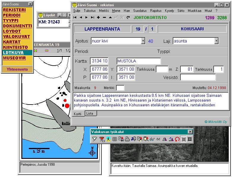 Tietokantaan voi tallettaa mm. karttoja ja valokuvia (tiettyyn paikkaan liittyen).