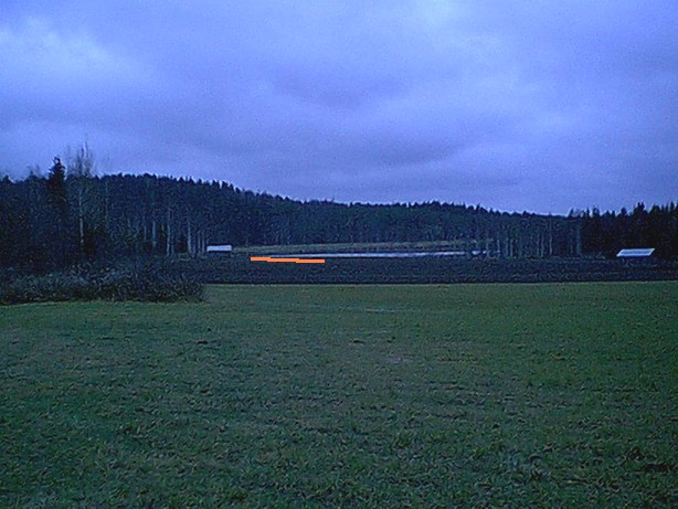 asuinpaikka lähellä järven rantaa pellon päässä (merkitty oranssilla). Kuvattu kaakkoon maantieltä.
