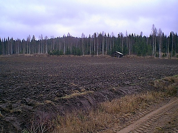 Asuinpaikka taustalla olevalla pellonlaella hiekkaisemmalla maalla, ladosta vasemmalle. Kuvattu pohjoiseen.